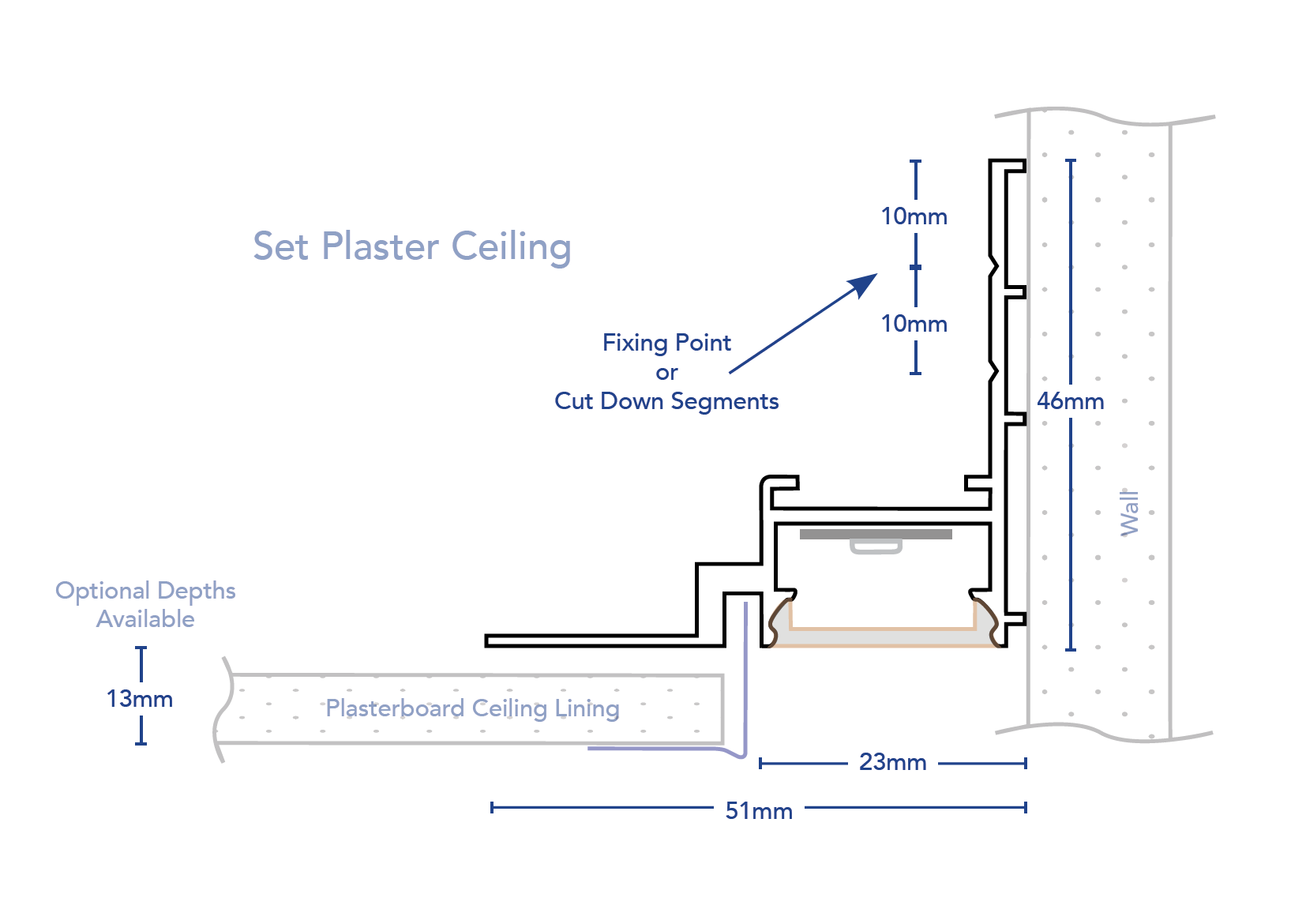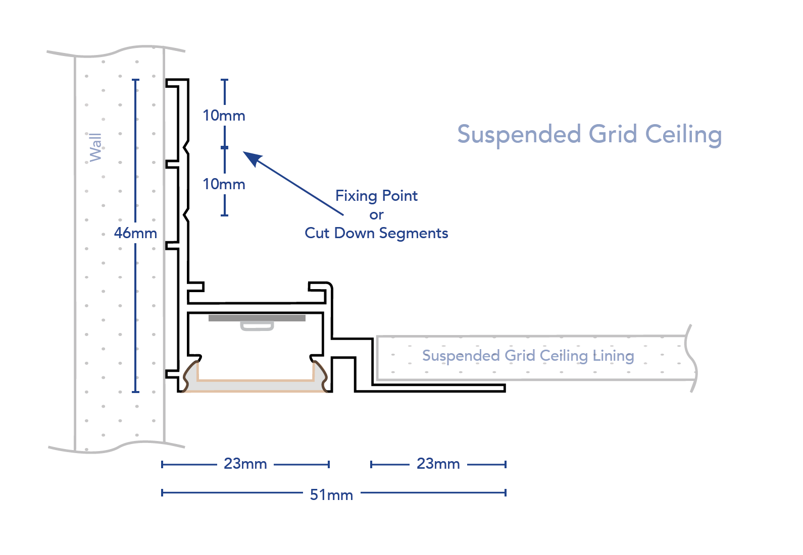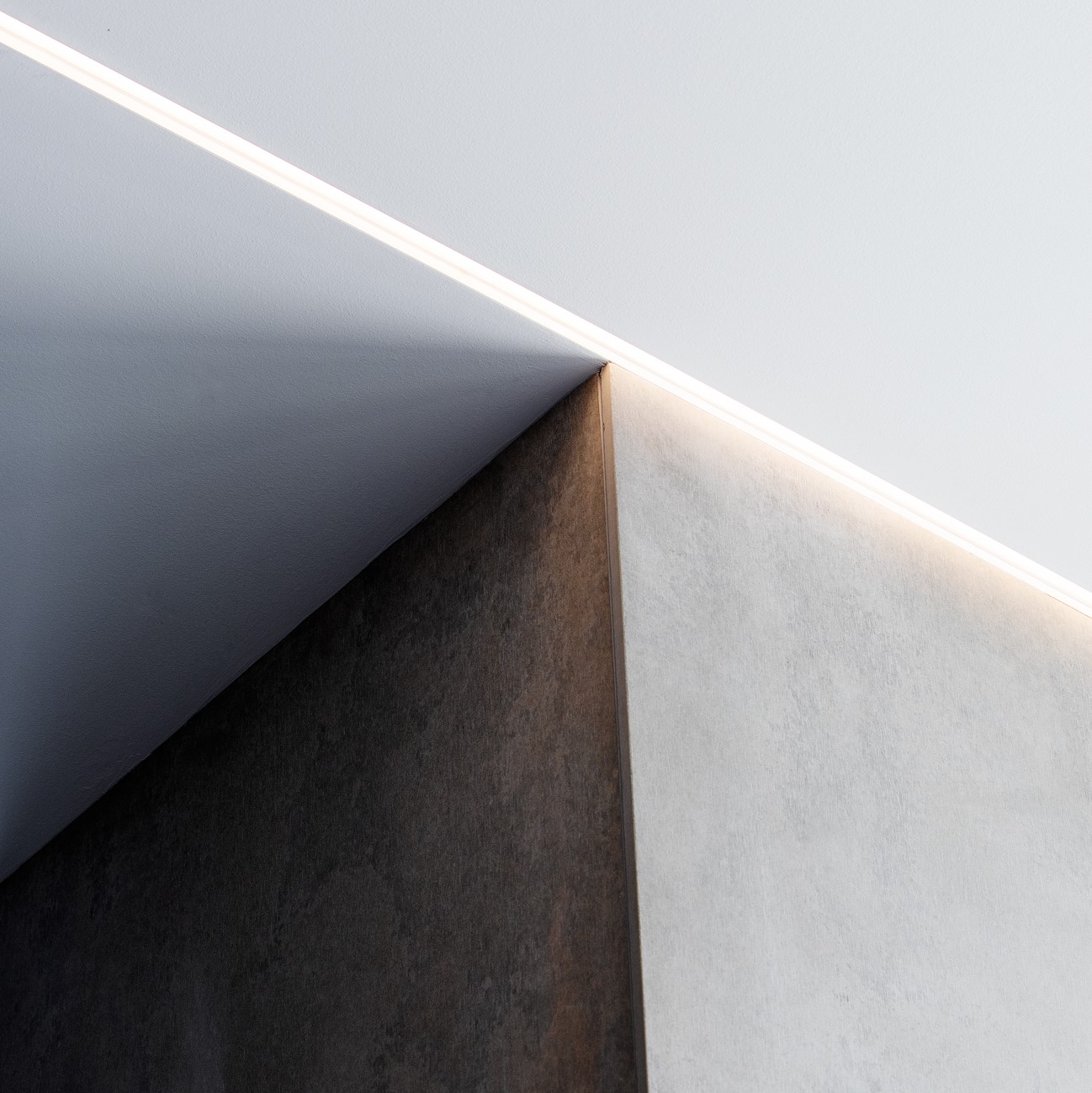 PT50 Shadowline is designed to create a clean perimeter shadow line and lighting option to Wall/Ceiling junctions. It can be used with either set plasterboard ceilings or suspended grid ceilings.