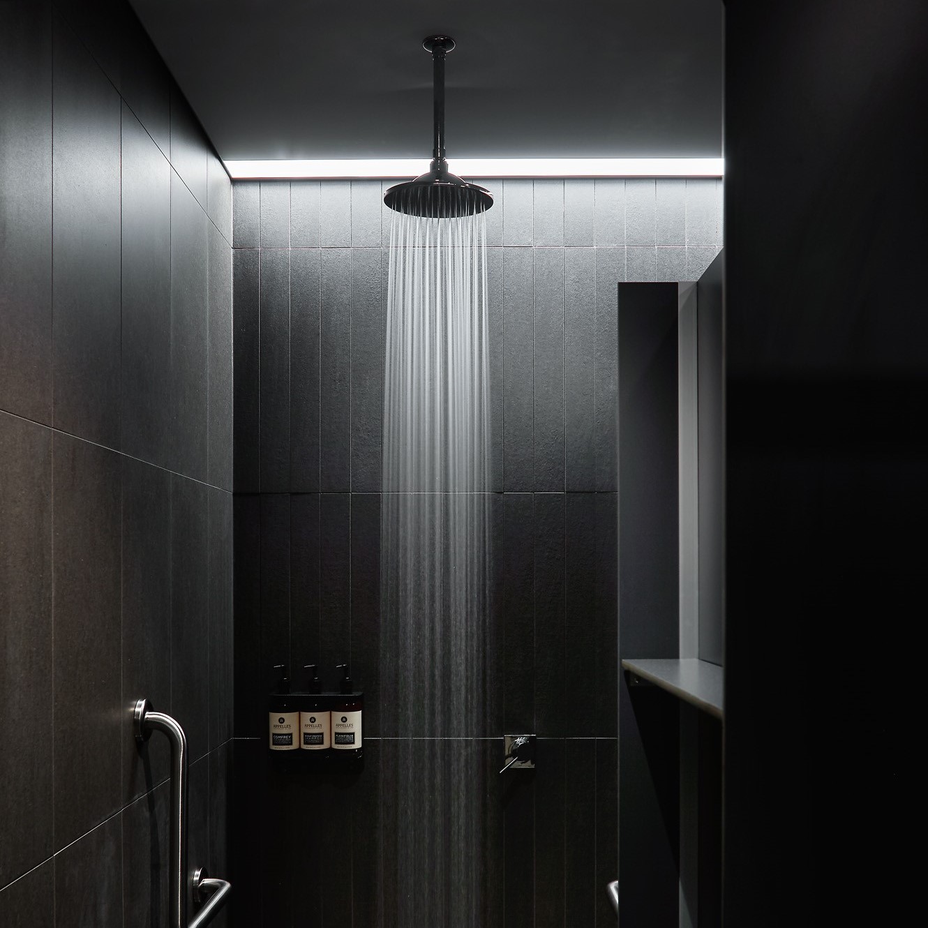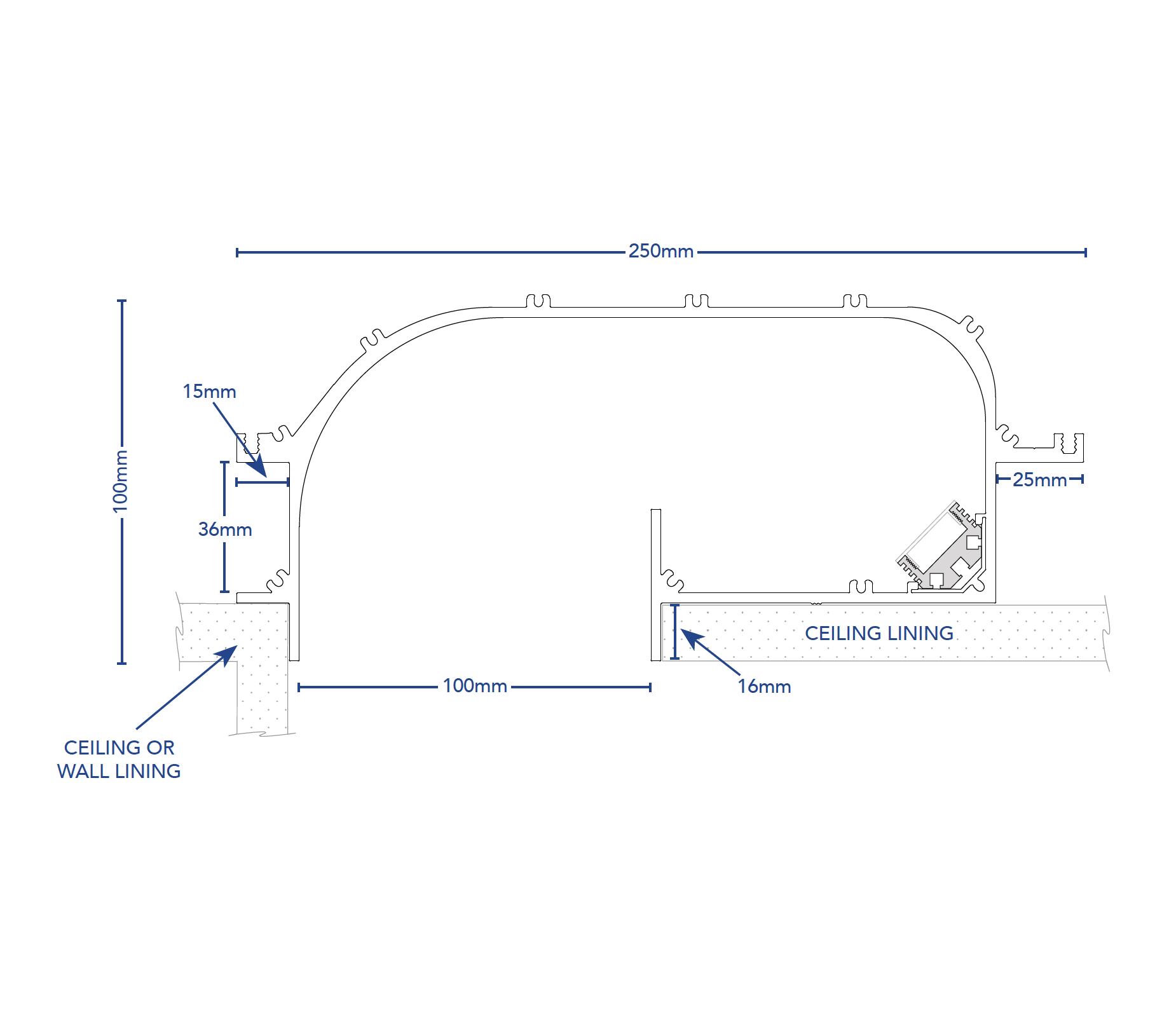 Ceiling recessed aluminium extrusion for general illumination or wall washing. 100m slot with curved reflector. The Horizon system can also be used in bathroom applications. With the inclusion of the Exhaust Duct accessory and IP rated light source the Horizon is then capable of having inline ducting connected to the rear of the extrusion. The internal light source is magnetically fixed and removable. Custom lengths up to 6 meters.